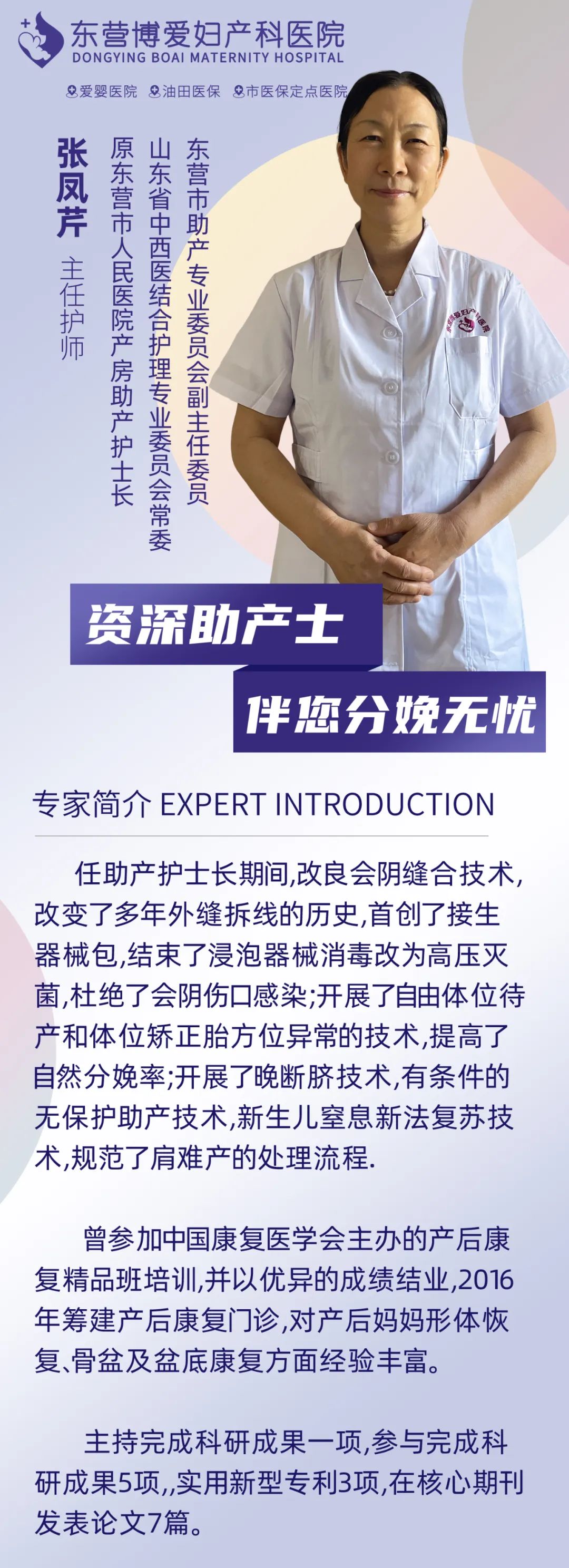 为解答孕妈妈们的担忧,为东营孕妈提供更高质量的分娩体验,东营博爱妇产科医院经过产科医护团队的精心筹备,自2023年6.15起将开设助产士门诊,由资深助产士张凤芹主任与您面对面、一对一交流,提供详细、全面的健康教育咨询,为您孕期所有的疑惑及顾虑给出专业的指导及建议。