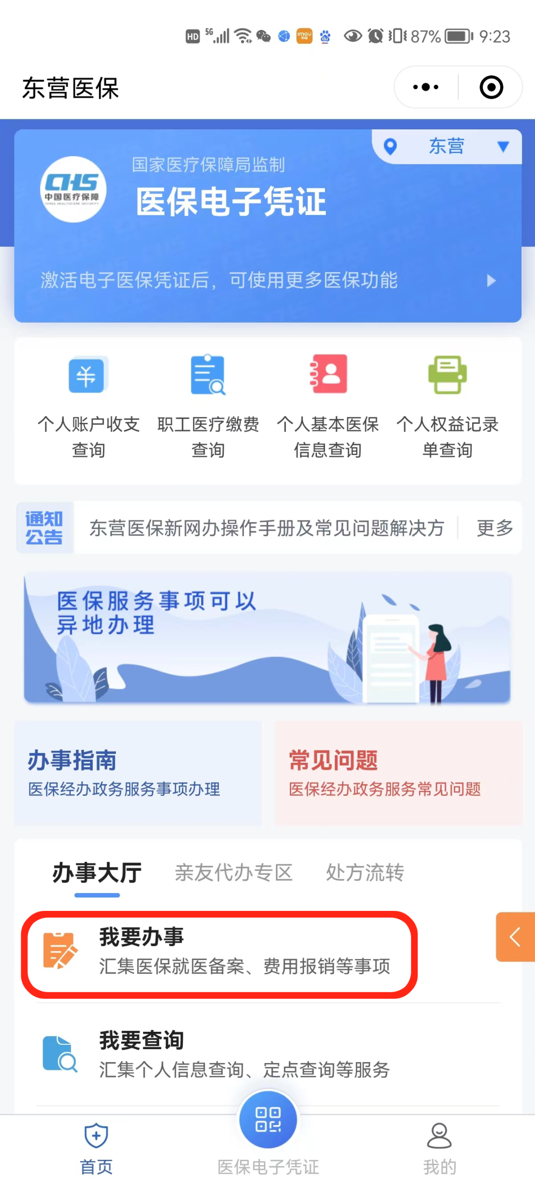 1、参保人员微信或支付宝搜索【东营医保】小程序,登录小程序,首页找到“我要办事”。